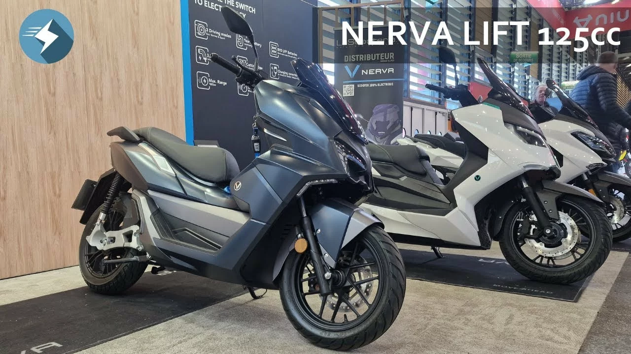 Scooter électrique Nerva Lift, équivalent 125cc.Doté d’une puissance moteur de 9kW. Batterie Blade BYD Lithium Fer Phosphate 4,147 kWh garantie 5 ans.